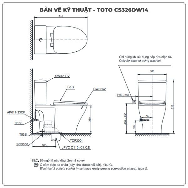Thông số kỹ thuật bồn cầu nắp rửa điện tử TOTO CS326DW14