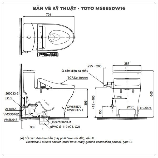 Thông số kỹ thuật bồn cầu 1 khối nắp rửa điện tử TOTO MS885DW16