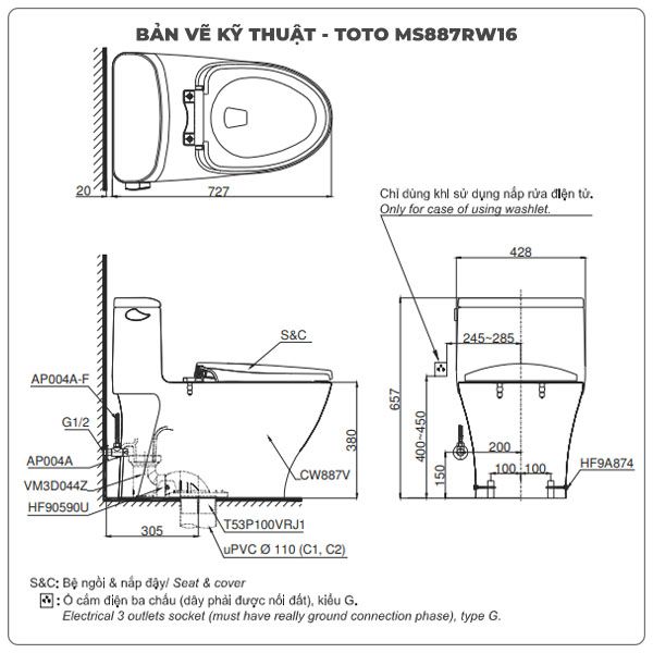 Thông số kỹ thuật bồn cầu thông minh TOTO MS887CRW16