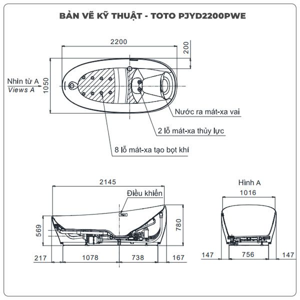 Thông số kỹ thuận bồn tắm đặt sàn TOTO PJYD2200PWE