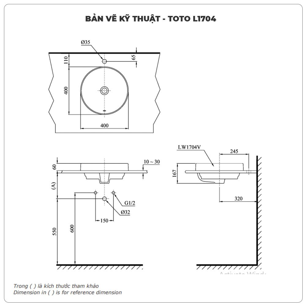 Thông số kỹ thuật chậu rửa mặt lavabo đặt bàn TOTO L1704